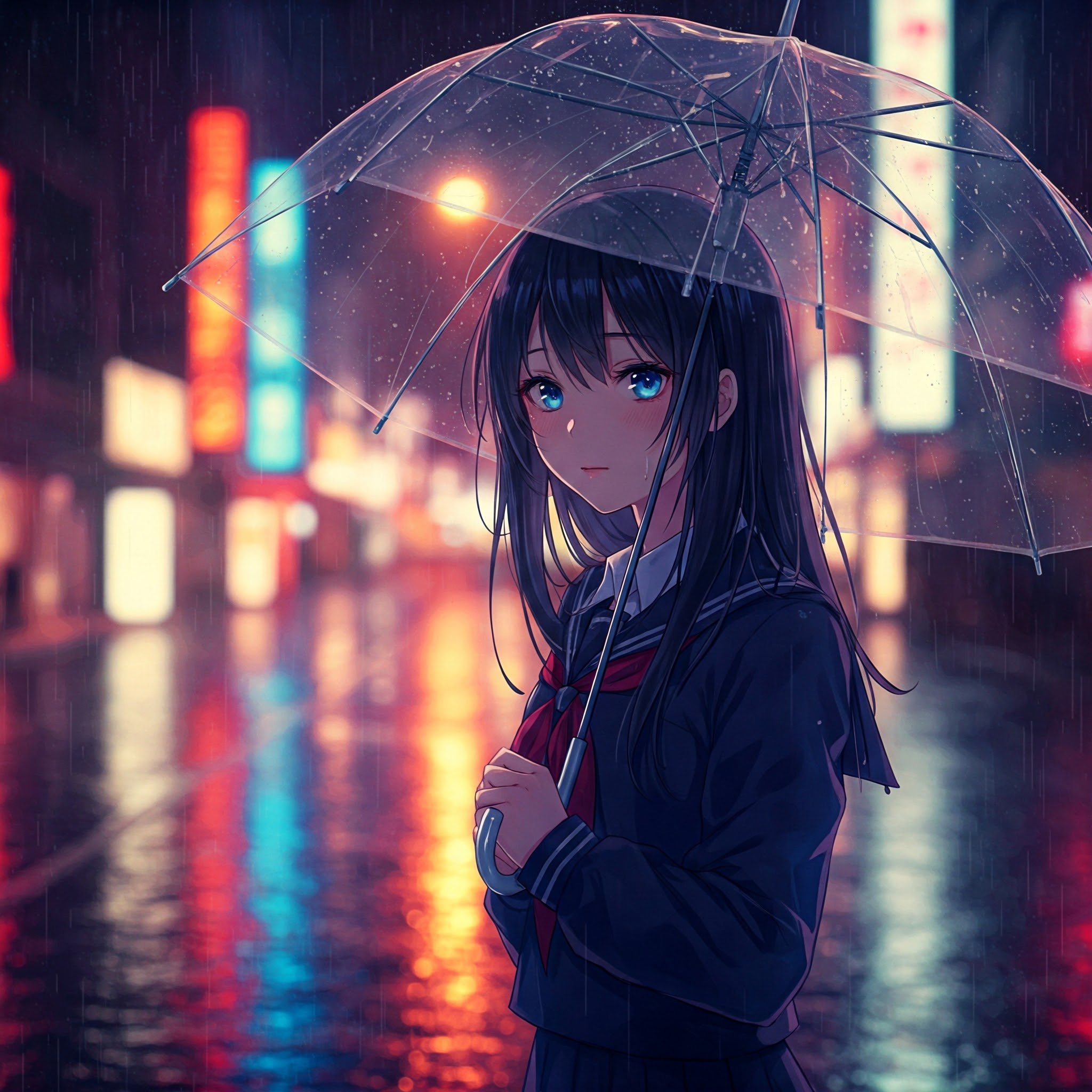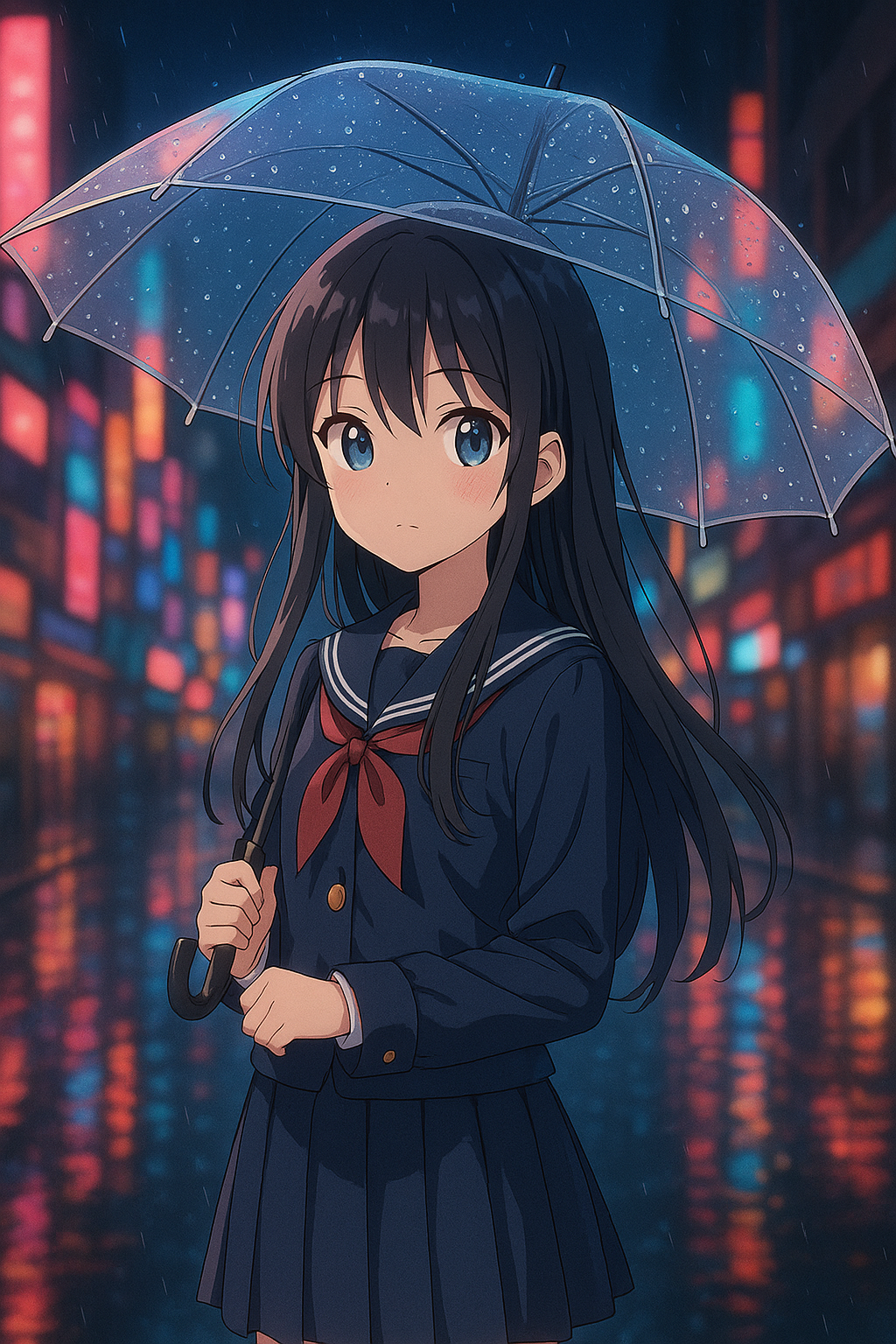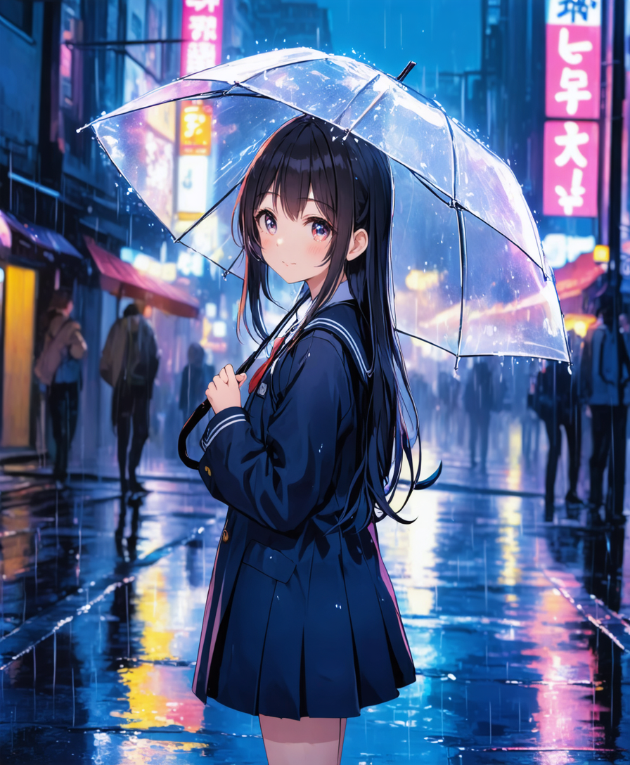 夜の雨の中、都市の通りの中央に立つ、透明な傘を差したアニメ風の少女。彼女は長い髪をしており、少し濡れている。濃紺のセーラー服を着ている。濡れた地面にはカラフルなネオン看板が反射している。柔らかなライティング、光のエフェクト、アニメ特有の陰影、精密に描かれた瞳と髪、日本のアニメスタイルで描かれている。