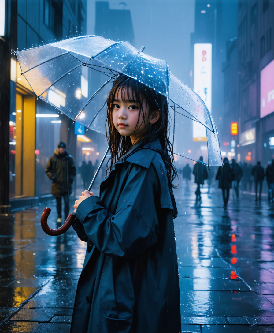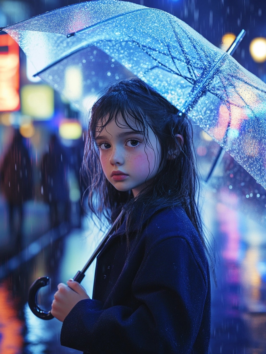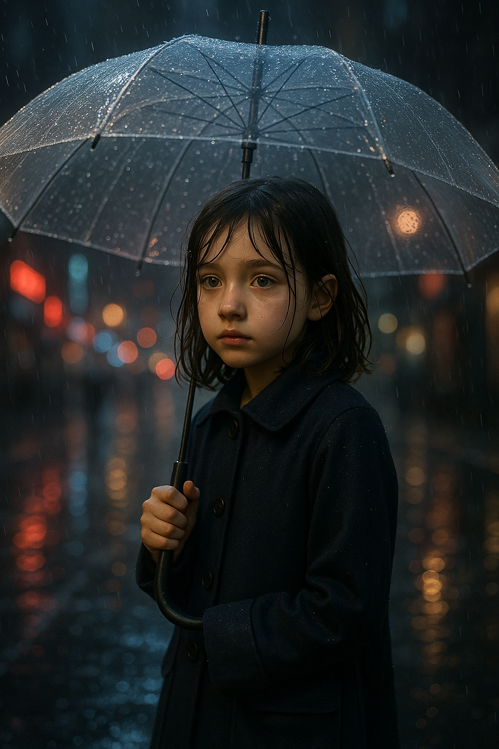 A young girl standing on a rainy city street at night, holding a transparent umbrella. She wears a dark blue coat and has wet hair sticking slightly to her cheeks. Reflections of neon lights shimmer on the wet pavement. Hyper-realistic, cinematic lighting, shallow depth of field, 4K, highly detailed, soft raindrops in the air.