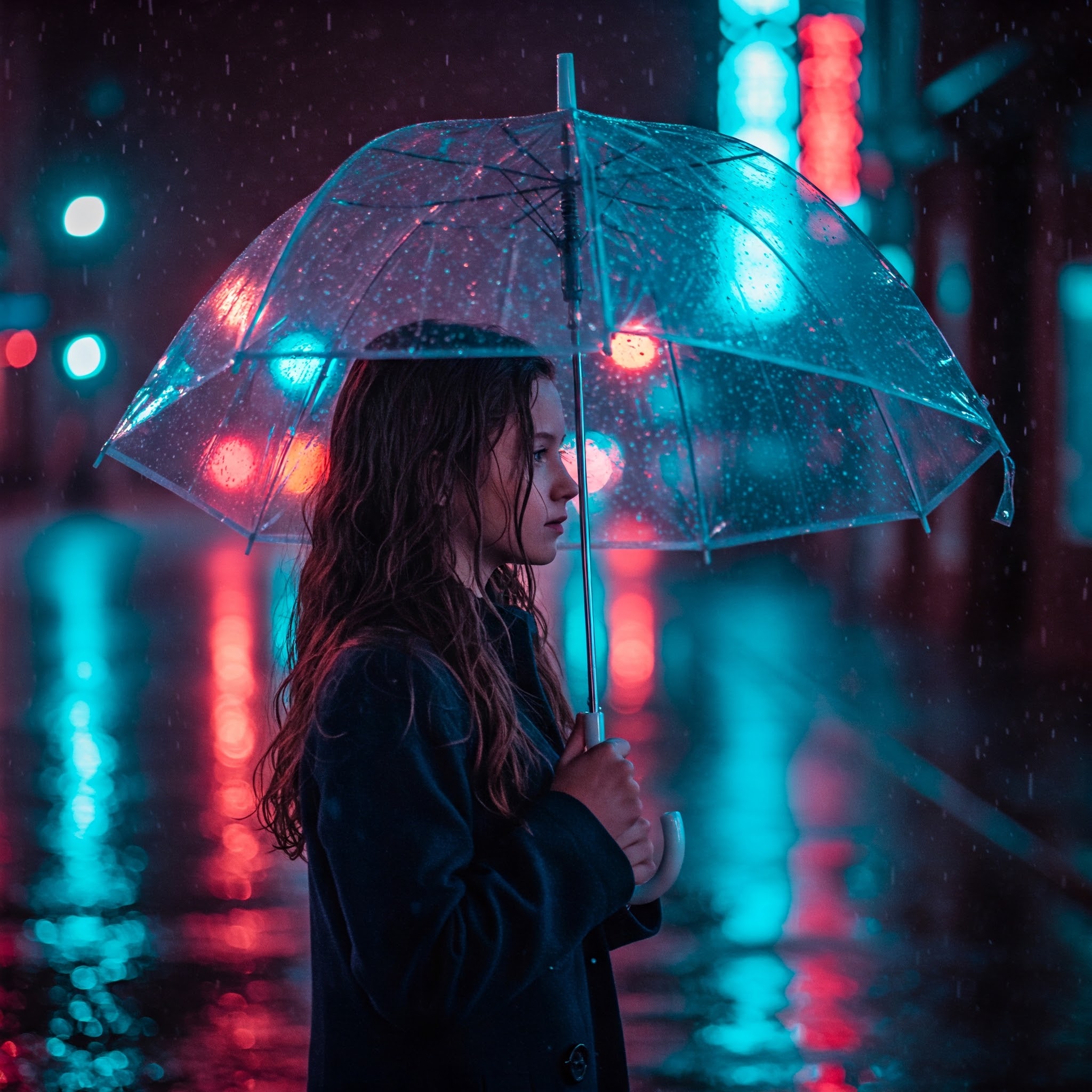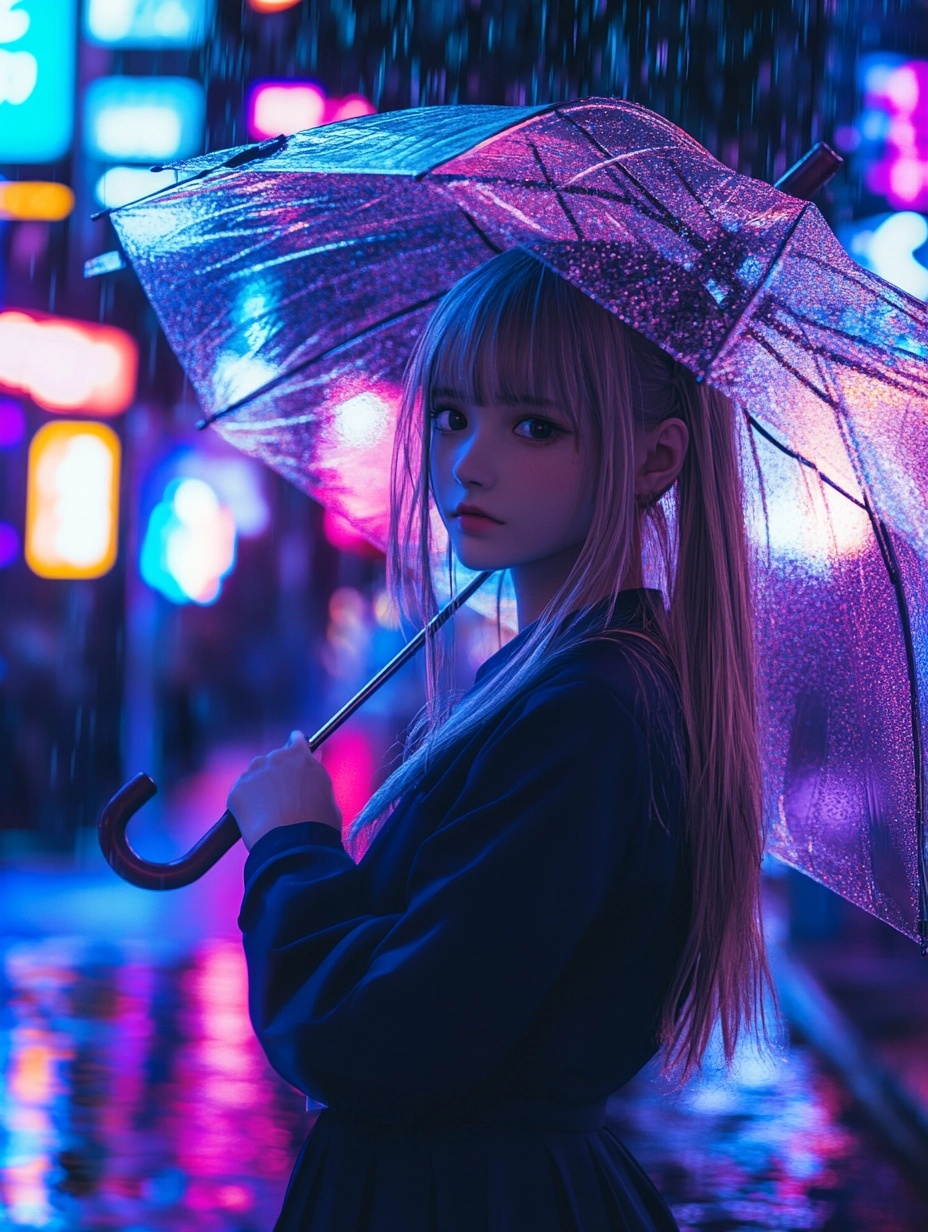 夜の雨の降る都市の通りに立つ少女。彼女は透明な傘をさしており、濃い青のコートを着ている。頬には濡れた髪が少し張り付いている。濡れた路面にはネオンの光が反射してきらめいている。ハイパーリアルな表現、映画のようなライティング、浅い被写界深度、4Kの高精細描写、空気中に浮かぶ柔らかい雨粒。