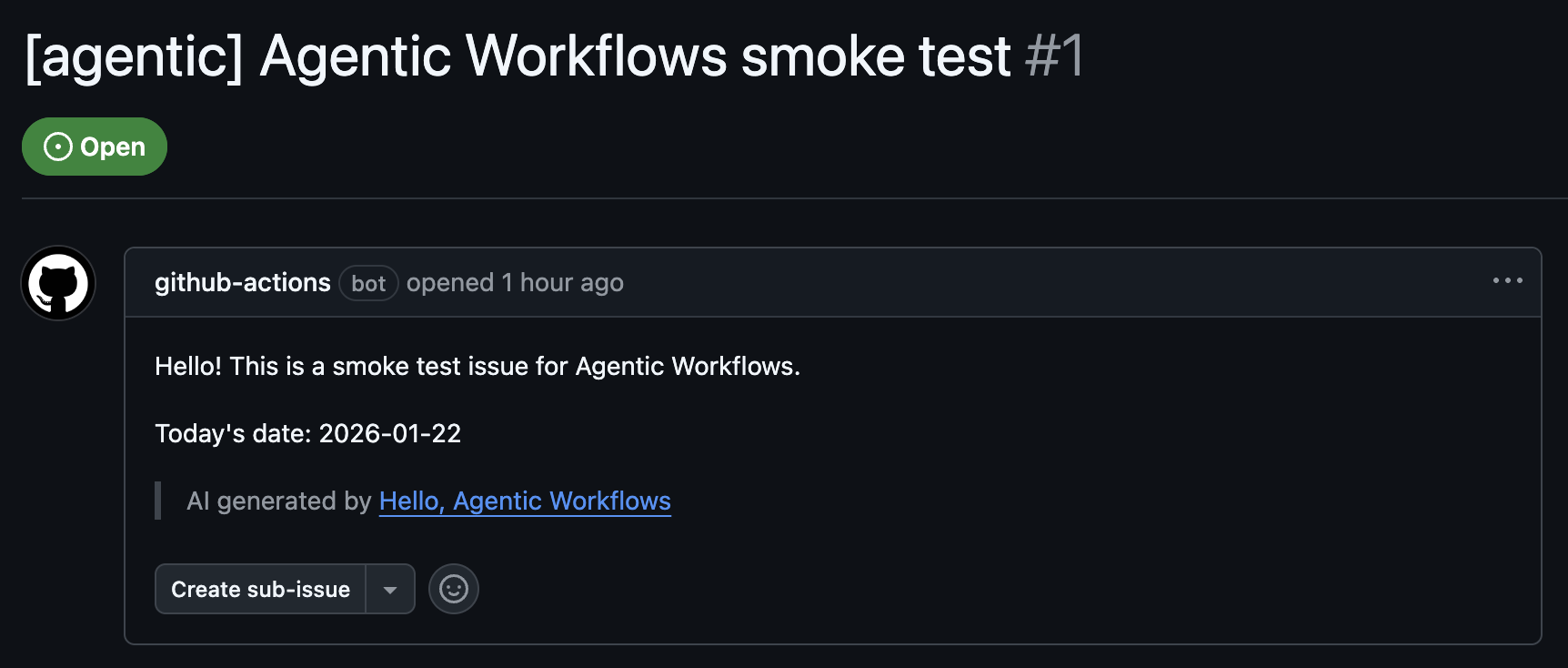 1. Create a new GitHub issue in this repository.2. Set the title to "Agentic Workflows smoke test".3. In the issue body, write a short greeting and include today's date in YYYY-MM-DD format.- コンパイル