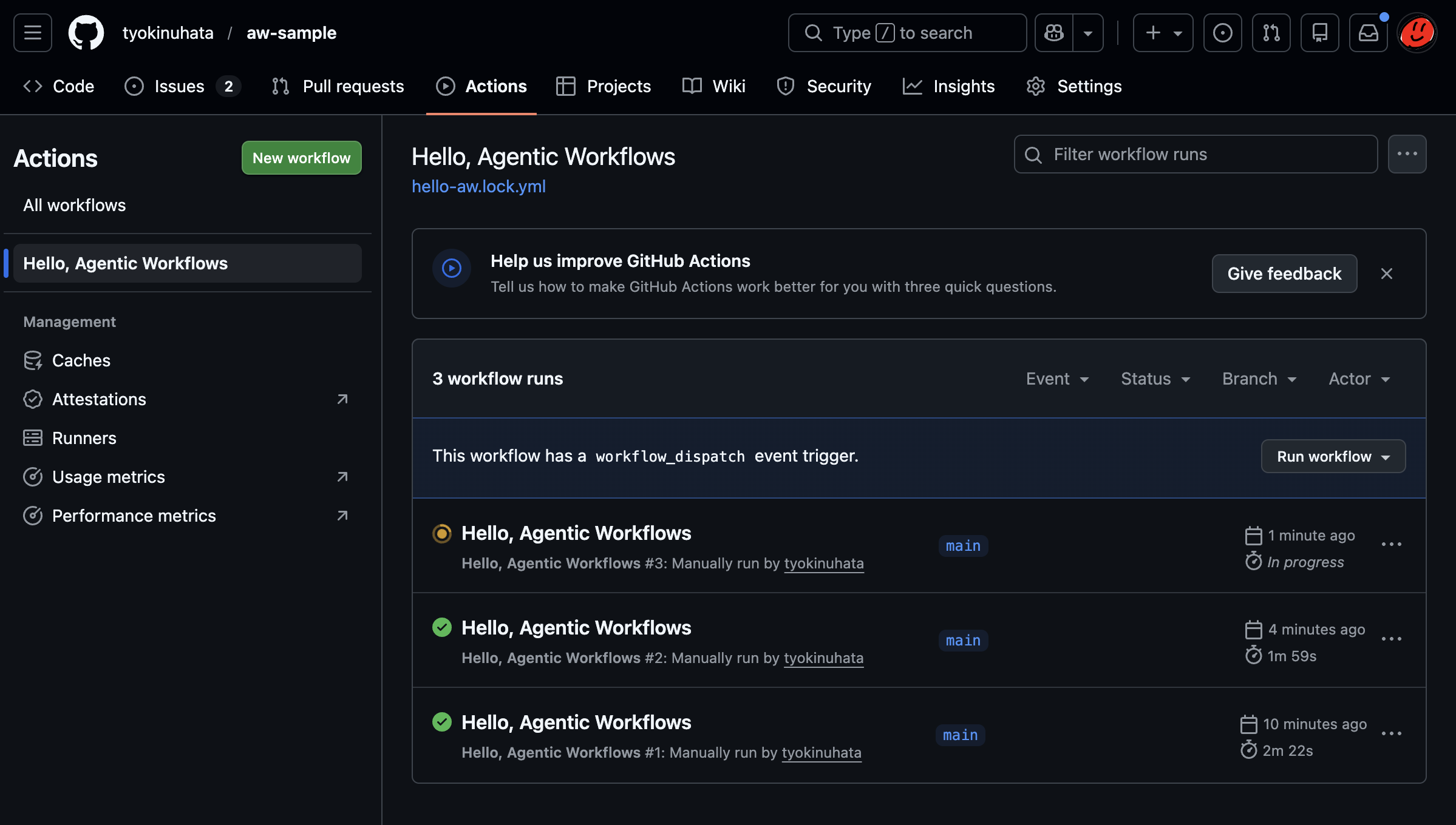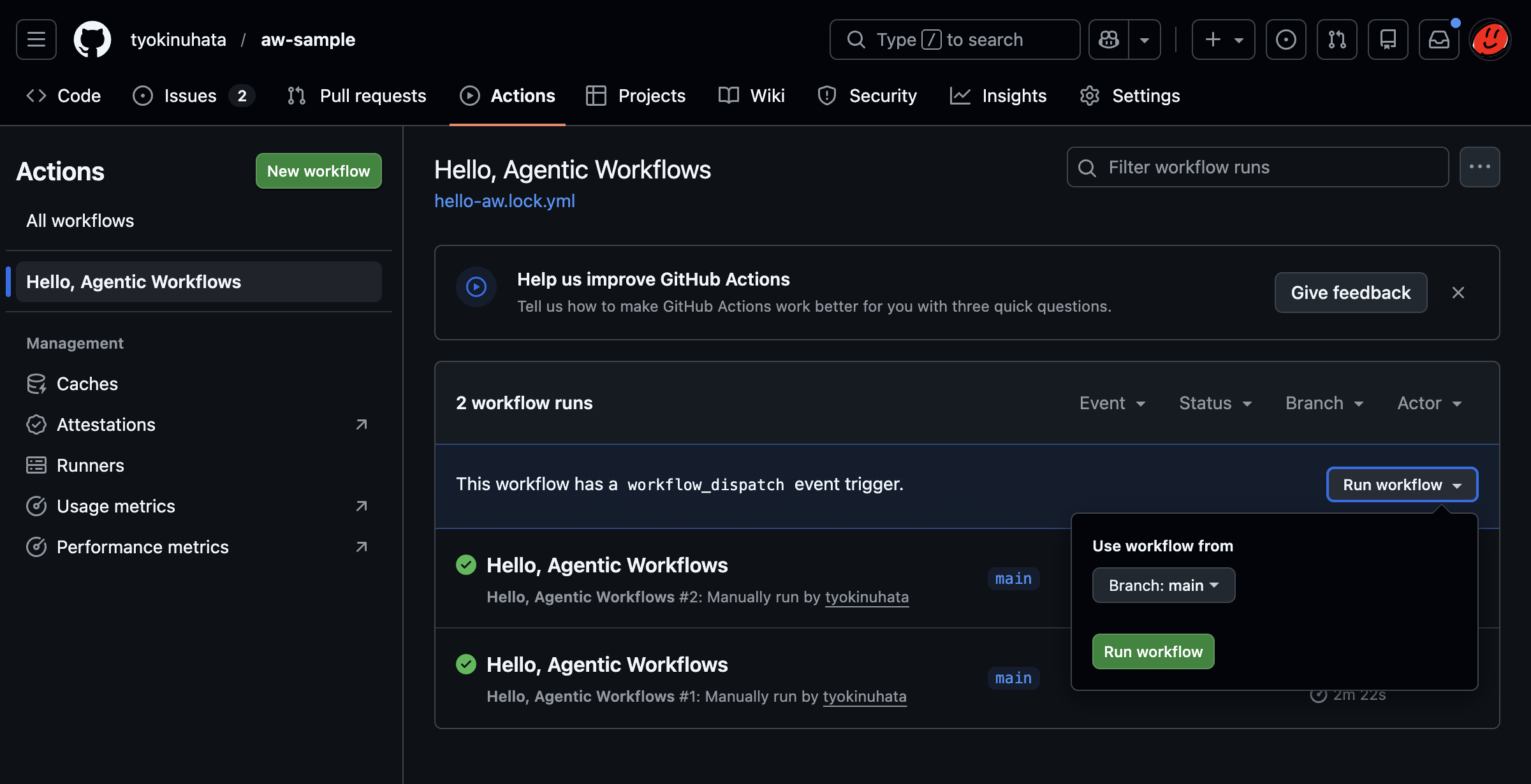 ✓ .github/workflows/hello-aw.md (55.5 KB)⚠ Compiled 1 workflow(s): 0 error(s), 1 warning(s)ワークフローの実行